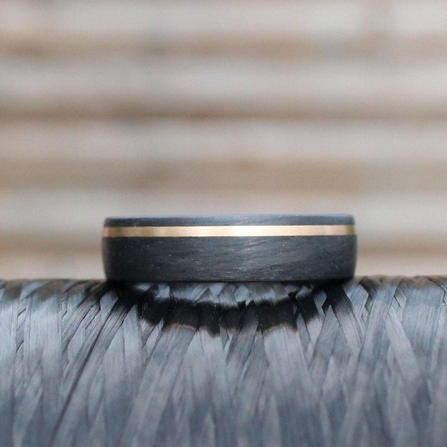 Carbon Fibre wedding ring band. Black wedding band with rose gold inlay for men