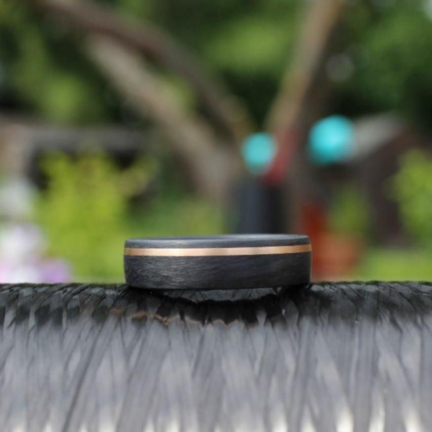 Carbon Fibre with a Yellow Gold or Rose Gold Inlay. Soft curve outer with Ultra comfort fit inside, Wedding Ring Band