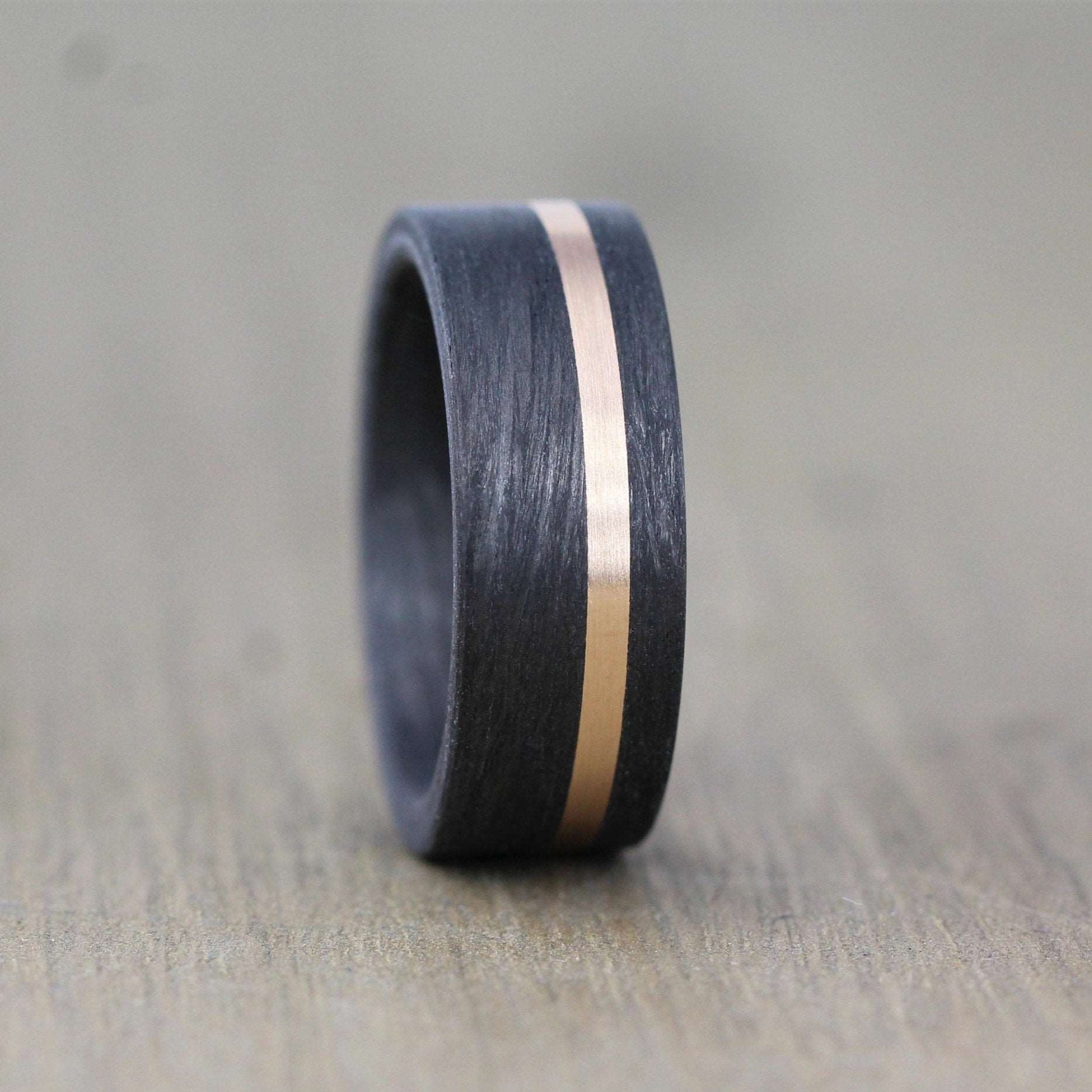 black carbon fibre wedding ring band. 8mm wide with a stripe of rose gold. black mans wedding ring uk