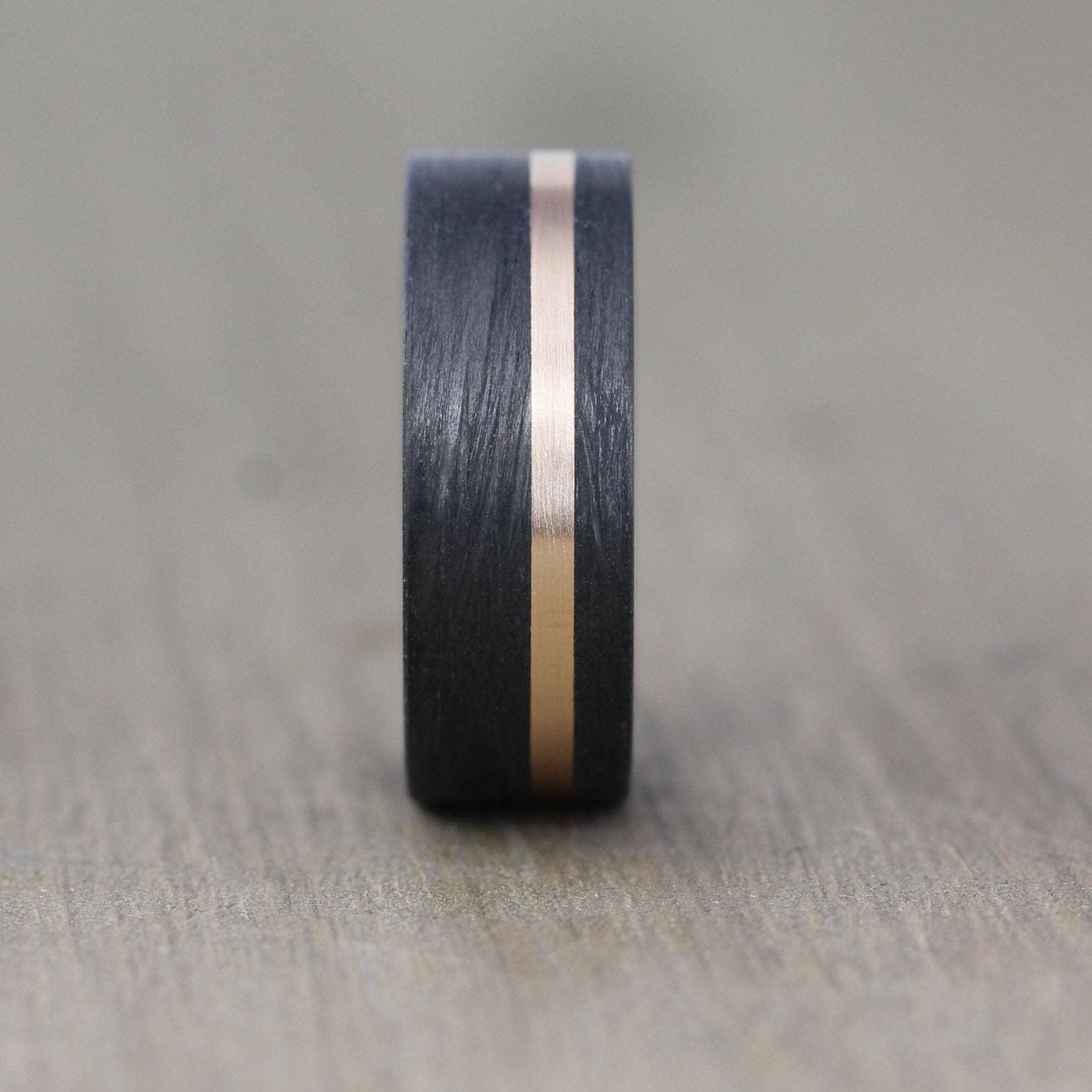8mm wide black wedding ring with a 2mm rose gold inlay. black carbon fibre wedding ring band. 8mm wide with a stripe of rose gold. black mans wedding ring uk