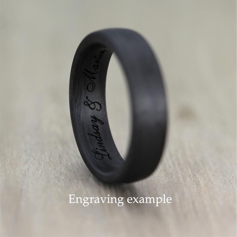 8mm, Carbon Fibre and Rose Gold Wedding ring band with a satin inside that is perfect for personalized engraving.