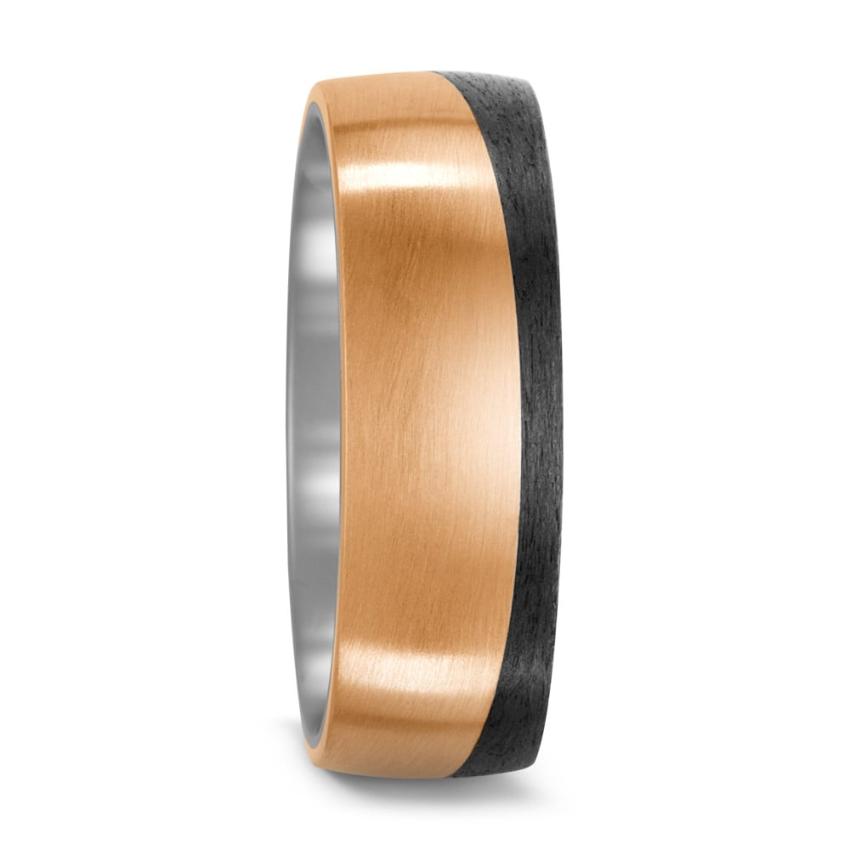Looking for a unique wedding ring band? This Carbon Fibre & matte Bronze, Men's wedding ring band has a Titanium inner sleeve. Bronze has a similar look to Rose Gold.