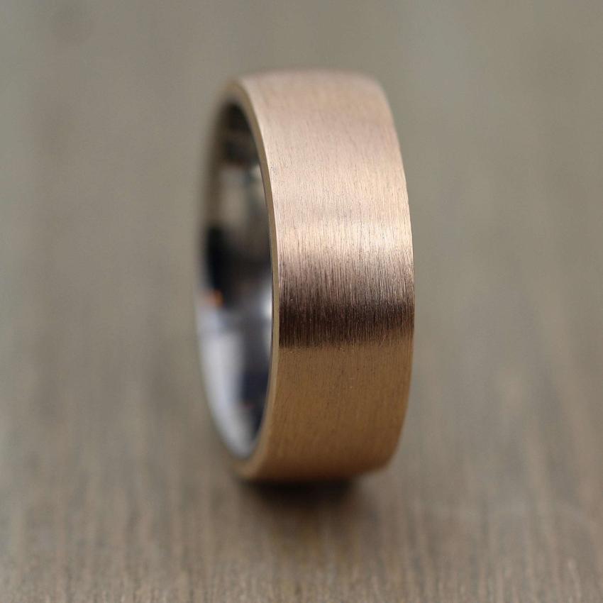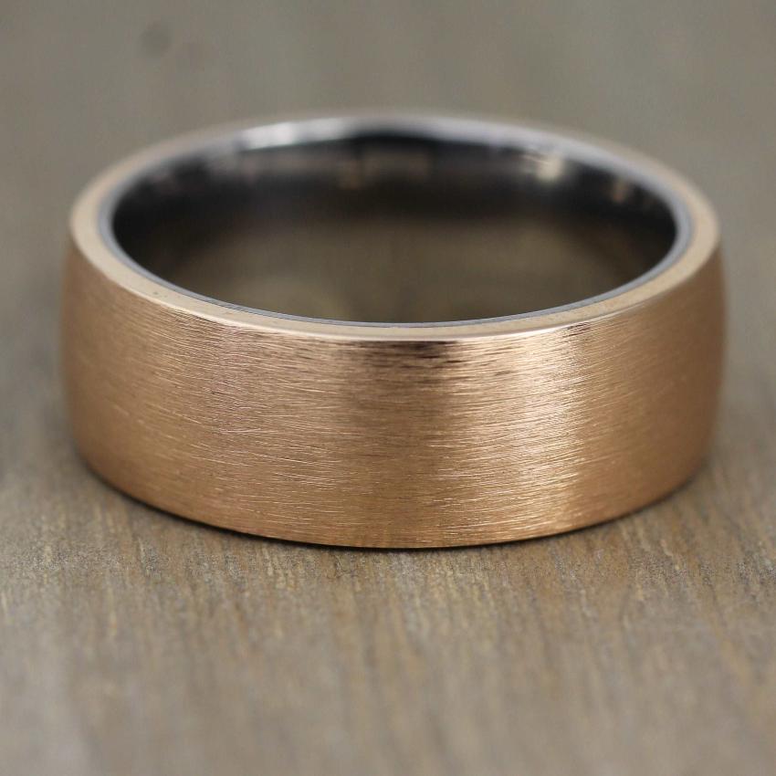 Looking for a unique wedding ring band? This Matte Bronze Men's wedding ring has a Titanium inner sleeve. Bronze has a similar look to Rose Gold.