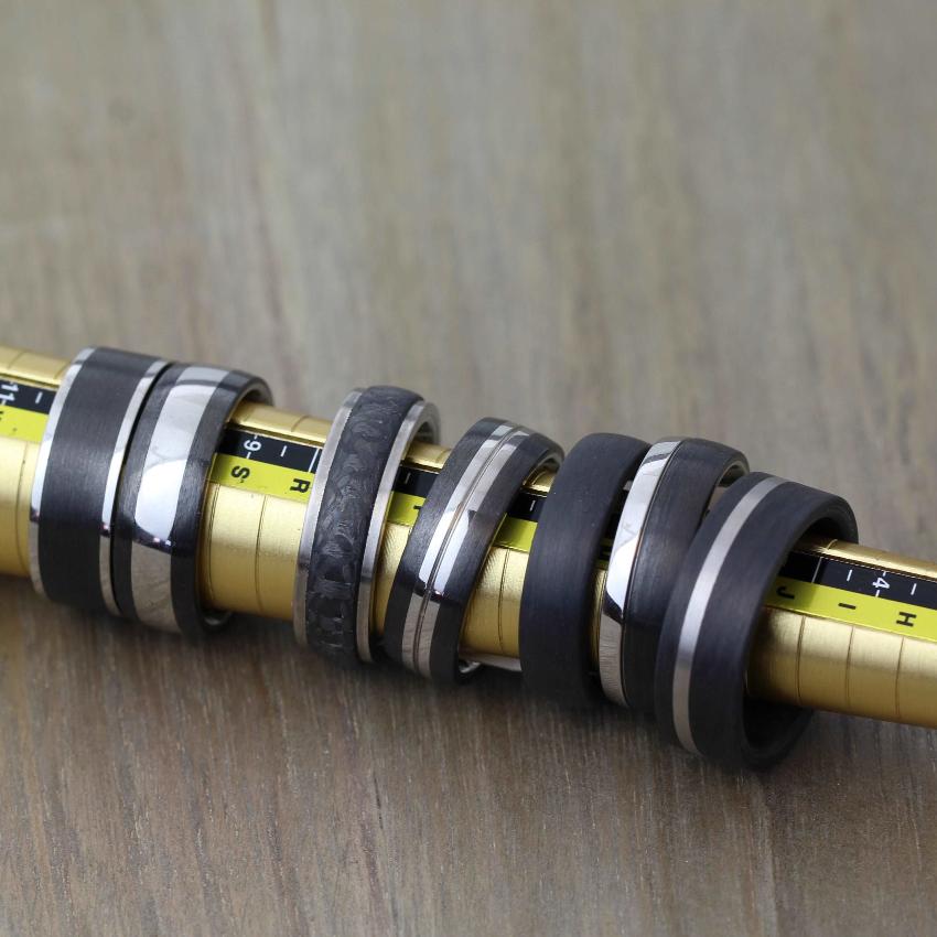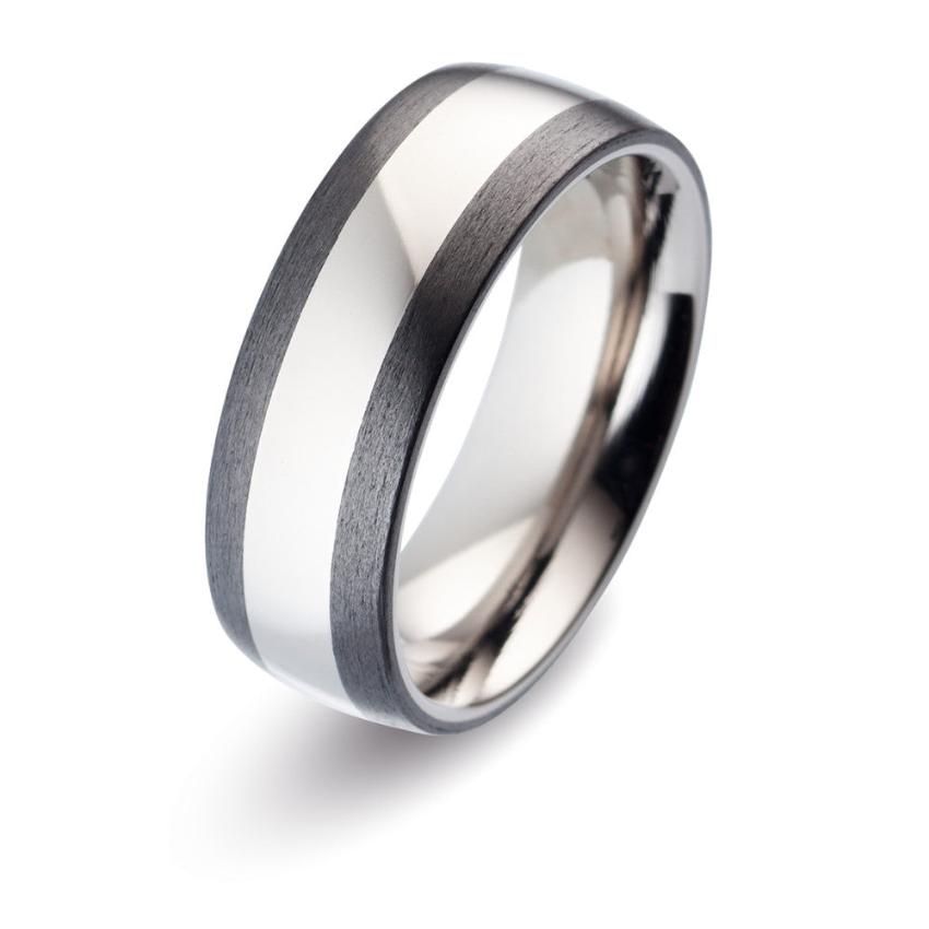 This striking looking wedding ring has a domed shape and 2mm parallel carbon fibre edges. In Titanium and Carbon Fibre for an exquisite combination of strength and comfort. Engraving is free, for that personal touch.